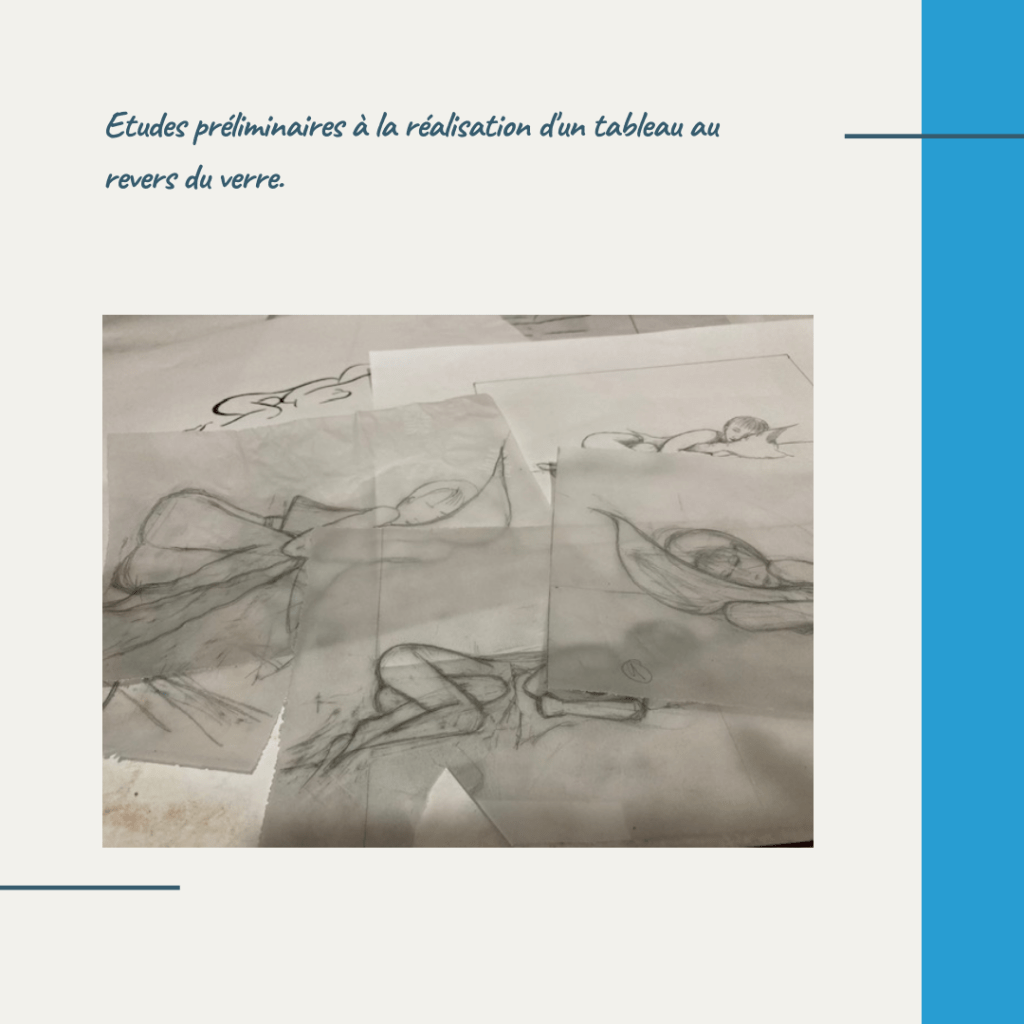 L’absence de repentirs possibles avec cette technique, entraîne la nécessité d’un travail préliminaire approfondi en dessin et pour cette création les études d’attitude ont engendré de nombreuses versions, complétées depuis par des recherches de traitement des visages… De belles étapes en promenant le regard sur les œuvres de Klimt, de Picasso, de Marie Laurencin ou encore Maillol… avant de reprendre mes pinceaux….