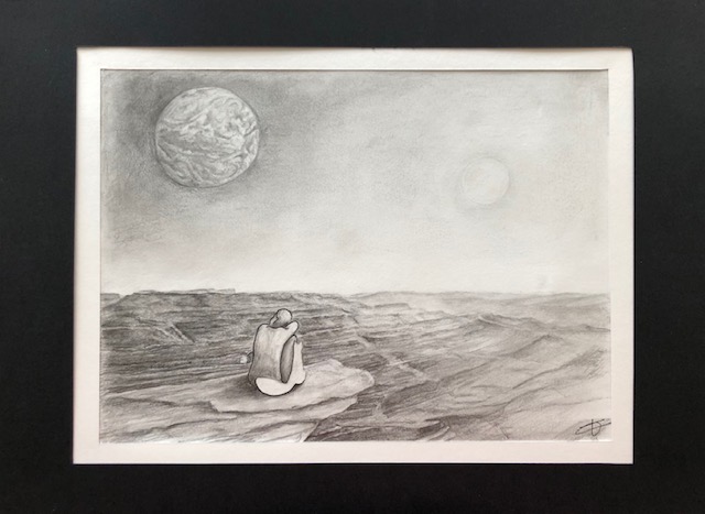 Le petit détour par l’exposition de dessins à la médiathèque Georges Brassens de Maizières-les-Metz m’aura emmenée en rêve, loin, au-dessus de la ville, avec pour seul bagage un oreiller dans le secret de la confidence… jusqu’aux confins du décor de Mars…